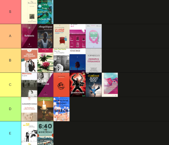 - Hurlevents by Fanny Britt, read for my “poésie, théâtre et écriture” class. A tier.